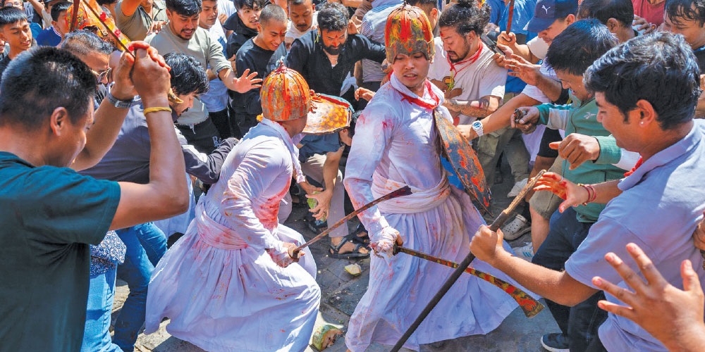 भादगाउँ, असोज १८ गते । बडादसैँको ११ औँ दिन पापाङ्कुशा एकादशीको अवसरमा शुक्रबार मध्यपुर थिमिमा मल्लकालीन युद्धको झल्को दिने गरी ‘खाँ पिहाँवईगु’ (खाँ निस्कने) जात्रा सम्पन्न भएको छ । तत्कालीन राजदरबारको रूपमा रहेको लाय्कुस्थित तलेजु भवानीको द्यो छेंबाट खड्ग, तरबार, ढाल, युद्धकवजलगायत मल्लकालीन युद्धमा प्रयोग हुने साधन बोकेर युद्ध कला प्रदर्शन गर्दै खाँ पिहाँवईगु जात्रा निकालिएको हो ।
