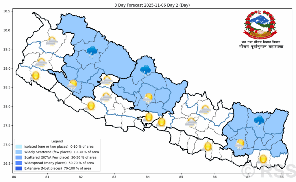 काठमाडौँ, कात्तिक २० गते । हाल मुलुकका पश्चिमी भागमा पश्चिमी न्यूनचापीय प्रणालीको आंशिक प्रभाव रहेको जल तथा मौसम पूर्वानुमान महाशाखाले जनाएको छ ।