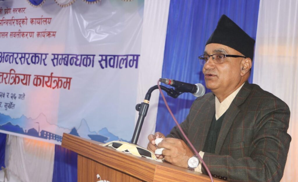 कर्णाली, कात्तिक २६ गते । कर्णाली प्रदेशका मुख्यमन्त्री यामलाल कँडेलले नागरिक हितका लागि सङ्घ, प्रदेश र स्थानीय तहबीचको समन्वय र सहकार्य अपरिहार्य भएको बताउनुभएको छ । मुख्यमन्त्री तथा मन्त्रिपरिषद्को कार्यालय सुर्खेतको आयोजनामा आजदेखि वीरेन्द्रनगरमा सञ्चालन भएको ‘प्रदेश तथा स्थानीय तहबीच अन्तरसरकार सम्बन्धका सवालमा छलफल तथा अन्तक्र्रिया’ को समापन समारोहमा मुख्यमन्त्री यामलाल कँडेलले विकास निर्माण तथा सेवा प्रवाहमा तीनै तहका सरकारहरूको सहकार्य र समन्वयको अभावले नागरिक असन्तुष्टि बढ्दै गएको बताउनुभयो ।