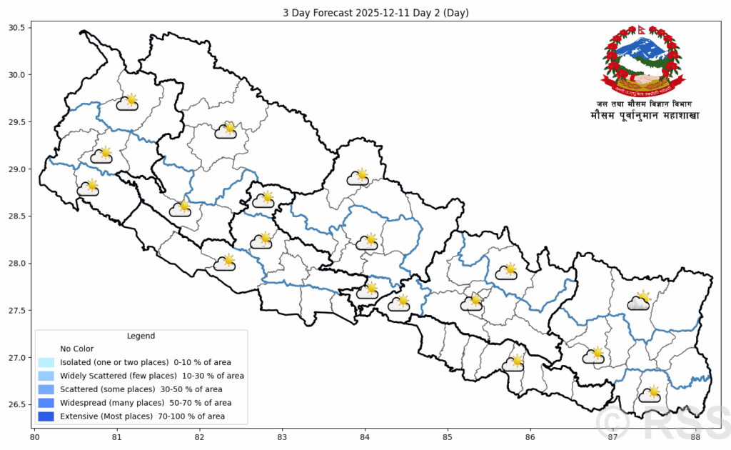 काठमाडौँ, मङ्सिर २५ गते । आज देशभर कुनै उल्लेखनीय मौसम प्रणालीको प्रभाव परेको छैन । जल तथा मौसम पूर्वानुमान महाशाखाका अनुसारआज राति देशभर मौसम मुख्यतया सफा रहने छ ।