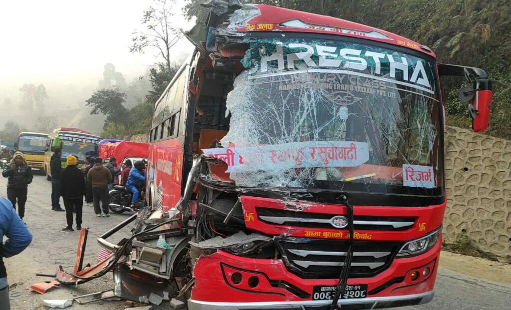 धादिङ, माघ २५ गते । थाक्रे गाउँपालिकास्थित महादेवबेँसी नजिकै दुईवटा यात्रुवाहक बस एकआपसमा ठोक्किएर दुर्घटना भएको छ । काठमाडौँबाट रसुवाका लागि छुटेको बागमती प्रदेश०१००६ख ५२०८ नम्बरको बस र दाङबाट काठमाडौँ जाँदै गरेको प्रदेश३–०१००६ख १५५२ नम्बरको बस आज बिहान ठोक्किएका हुन्।