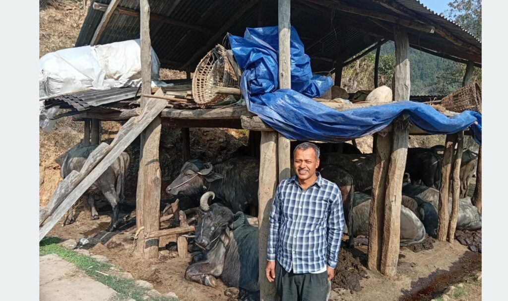 “वरपर जङ्गलको बीचमा पाल टाँगेर मैले यो व्यवसाय सुुुरु गरेको हुँ”, आचार्यले भन्नुुभयो, “पछि गोठ तथा धन्सार बनाएर त्यसलाई व्यवस्थित गर्दै लगेँ, अहिले गोठमा ३० भैँसी छन् ।”