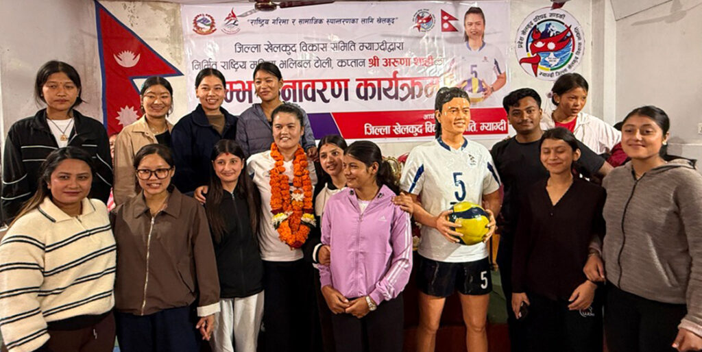 म्याग्दी, फागुन २७ गते । राष्ट्रिय महिला भलिबल टोलीकी कप्तान अरुणा शाहीको गृहजिल्ला म्याग्दीको सदरमुकाम बेनीमा आज स्तम्भ अनावरण गरिएको छ । रघुगङ्गा गाउँपालिका–३, पिप्लेमा जन्मनुभएकी शाहीले खेलकुदको माध्ययमबाट राष्ट्रिय तथा अन्तरराष्ट्रियस्तरमा जिल्लाको गरिमा बढाउन भूमिका निर्वाह गरेकामा जिल्ला खेलकुद विकास समिति म्याग्दीले उहाँको प्रतिमा निर्माण गरेको हो । दुई हातमा भलिबल रहेको पाँच फिट आठ इन्च उचाइको फाइबरबाट निर्मित प्रतिमा निर्माण गरिएको हो । उक्त प्रतिमा बेनी नगरपालिकाका प्रमुख सुरत केसीले अनावरण गर्नुभयो ।