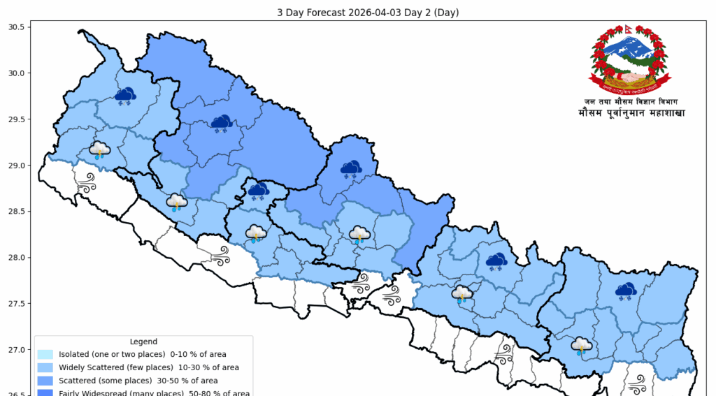 साथै गण्डकी, कर्णाली र सुदूरपश्चिम प्रदेशका पहाडी तथा हिमाली क्षेत्रका केही स्थानमा मेघगर्जन र चट्याङसहित मध्यम वर्षा वा हिमपात हुन सक्ने तथा अन्य प्रदेशका पहाडी र हिमाली क्षेत्रका एकदुई स्थानमा हल्का वर्षा वा हिमपात हुने पूर्वानुमान गरिएको छ ।