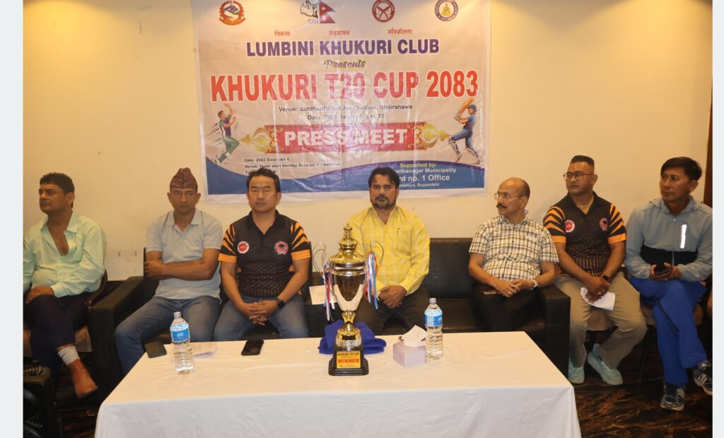 रुपन्देही, वैशाख ६ गते । रुपन्देहीको भैरहवामा वैशाख ८ गतेदेखि खुकुरी टी–२० कप क्रिकेट प्रतियोगिता हुने भएको छ । लुम्बिनी खुकुरी क्लब बेलहियाको आयोजनामा सिद्धार्थनगर नगरपालिका–३ स्थित सिद्धार्थ क्रिकेट रङ्गशालामा प्रतियोगिता सञ्चालन हुनेछ । आज यहाँ पत्रकार सम्मेलन गरी आयोजकले वैशाख १५ गतेसम्म प्रतियोगिता सञ्चालन हुनेबारे जानकारी दिएको हो ।