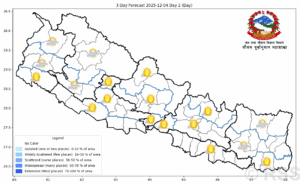 काठमाडौँ, मङ्सिर ११ गते । हाल देशभर कुनै उल्लेखनीय मौसम प्रणालीको प्रभाव नरहेको जल तथा मौसम पूर्वानुमान महाशाखाले जनाएका छ । आज दिउँसो कोशी, मधेस, वाग्मती र गण्डकी प्रदेशमा आंशिक बदली रही बाँकी भू–भागमा मौसम ...